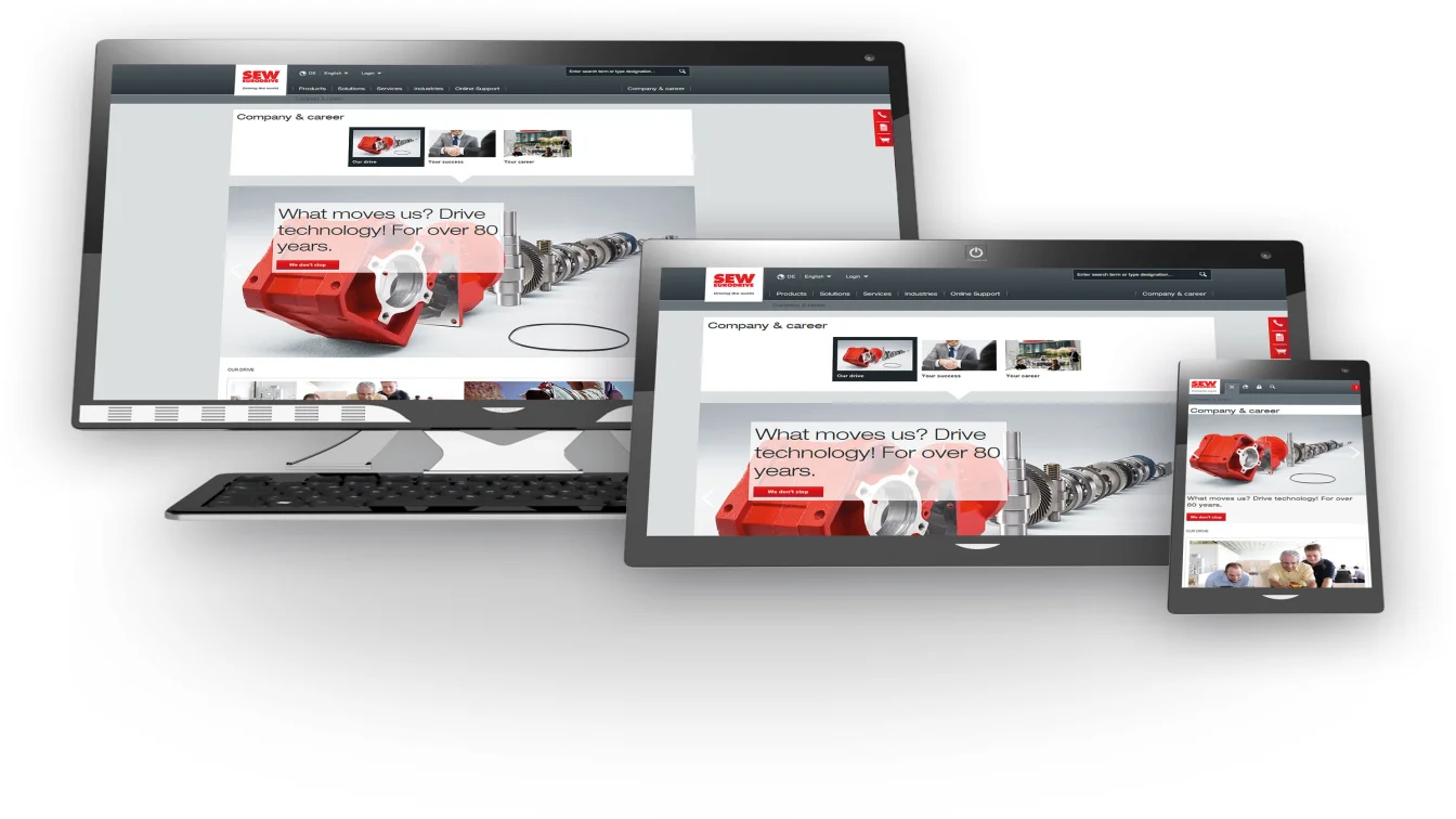 For customers, there is one new feature that is particularly important. The DriveGate customer portal, which up until now has been run on a separate platform, has been integrated into the new website and renamed “Online Support”. This brings several new benefits. Customers now stay within one system for all of their needs. The structure is based on process stages and ensures straightforward, direct access to the functions relevant to particular customers. Many online services can be accessed without log-in. Only functions involving sensitive or customer-specific content require user registration and log-in. As part of the restructuring, there are a whole host of new and expanded functions to support users in their work with SEW-EURODRIVE and provide them with the information they need. This includes quick retrieval of CAD data in many different 2D and 3D formats and documentation, simple product configuration, clearly structured transaction management and much more.